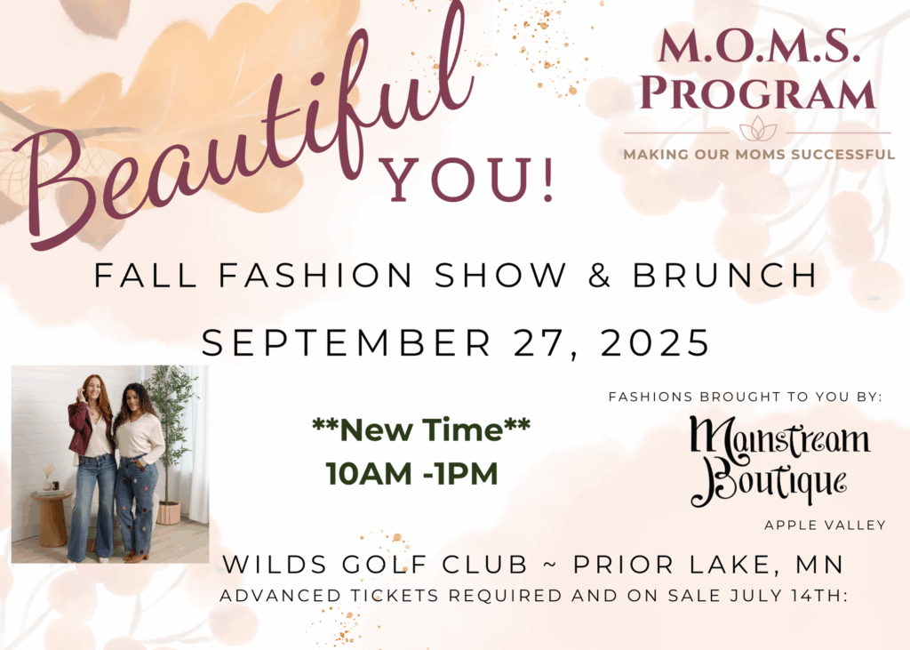 Gather with like-minded women to celebrate the season’s latest fashion trends, enjoy a delicious brunch, and support a meaningful cause. All proceeds benefit the M.O.M.S. Program, helping single moms in Dakota and Scott Counties build brighter futures.
